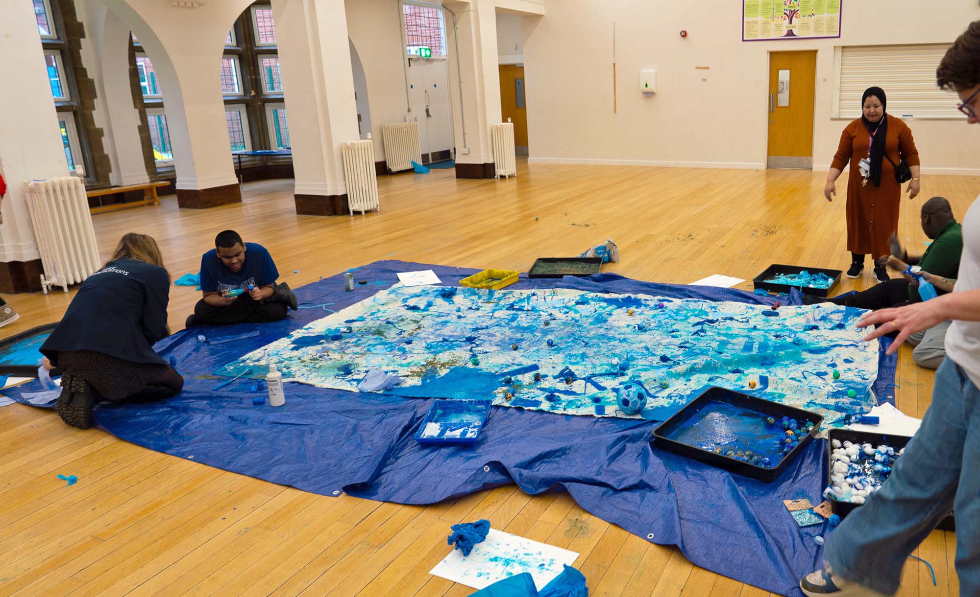 "Working with the kids at Ellesmere was a fun & messy time. By allowing them to be free on the canvas to do what they want with a specific colour palette created the right space for sporadic mark-making. I felt honoured to tie it all together with my signature use of pyrotechnics and bring Neptune into the picture."